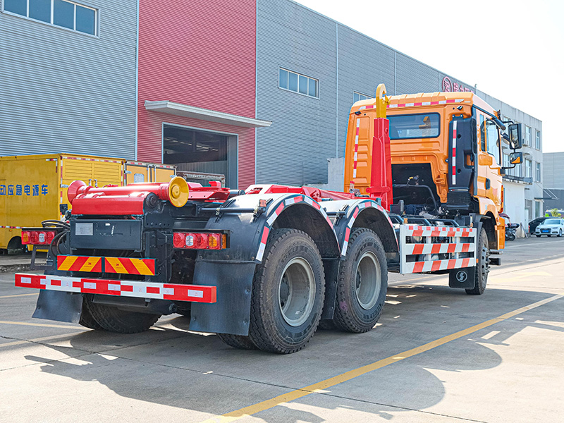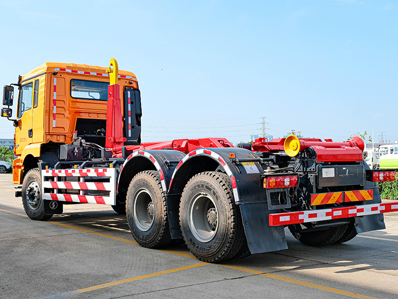 該車可將地下垃圾箱內(nèi)的垃圾及垃圾箱一同拉車上運走同時可自卸,降低了工人的勞動強度。該垃圾車的收運方式是目前世界上廣泛采用的垃圾收運方式,可以實現(xiàn)一車多箱,大大降低了配備成本和空間等等;其專用裝置的功能均以汽車發(fā)動機為動力,通過液壓機構手動或電控來實現(xiàn)。車輛的箱體采用優(yōu)質(zhì)炭鋼板全密封焊接結構,具有強度高、重量輕、不產(chǎn)生二次污染等優(yōu)點。